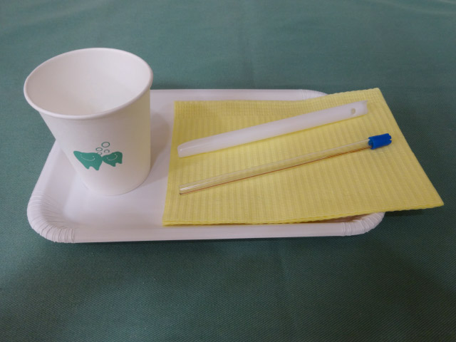 紙コップやバキュームチップなど可能な限り使い捨ての道具を使用しています。 グローブも患者様ごと新しいものに交換しています。 |