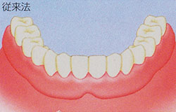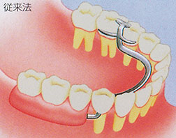 健康な歯に金属のバネをかけて入れ歯を固定します。違和感があり、バネをかけた歯にも負担がかかります。